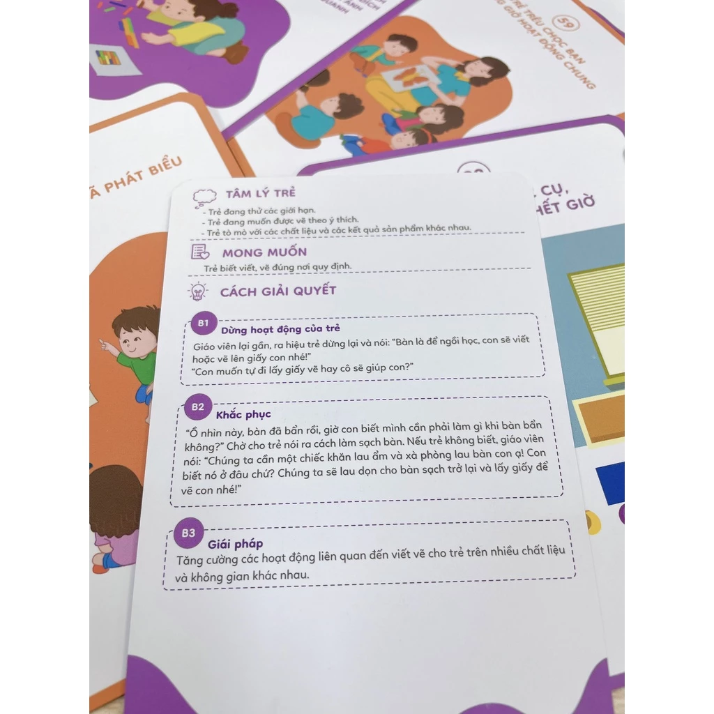 Với 60 tình huống được khảo sát, chọn lọc từ những trải nghiệm thực tế nhất. Những hình ảnh được vẽ tỉ mỉ cùng với đội ngũ đã tận tâm suốt nhiều tháng trời. Bộ thẻ sẽ giúp giáo viên hiểu được tâm lý của trẻ, từ đó hiểu được những hành vi của trẻ được thể hiện ra ngoài và có cách xử lý nhẹ nhàng, hợp lý, từng bước cụ thể chi tiết.